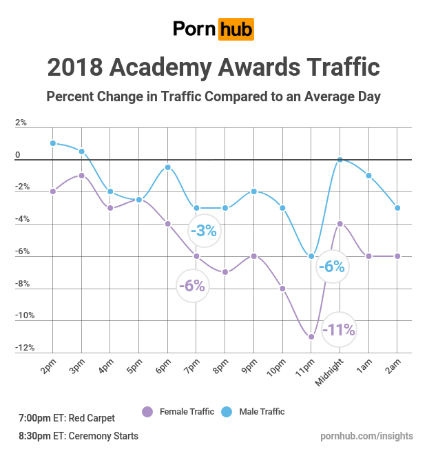 Our statisticians discovered that women were far more likely to tune out of Pornhub to tune into the awards. Female traffic was down -6% at 7pm as the Red Carpet coverage kicked off, and plummeted -11% below average at 11pm.