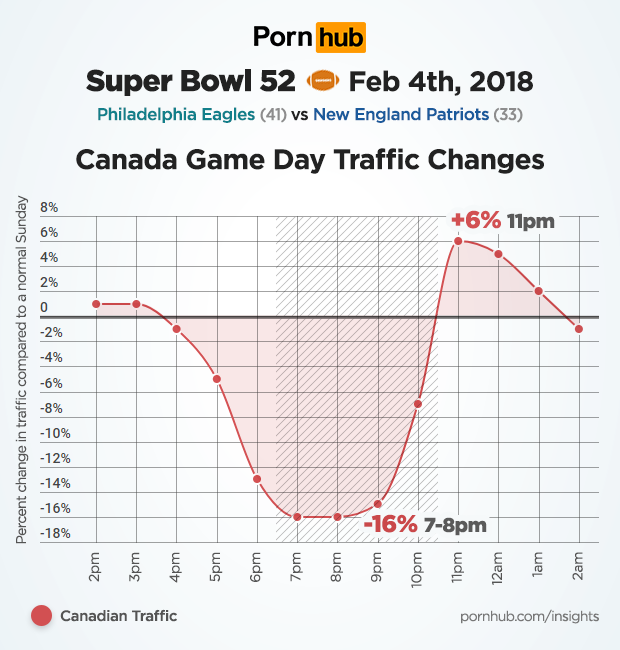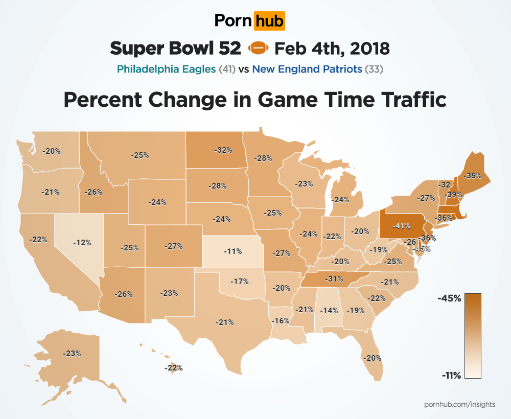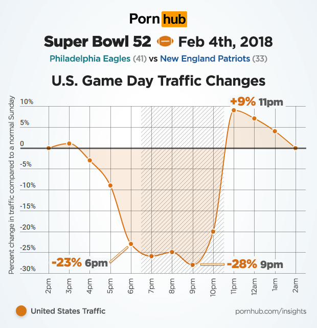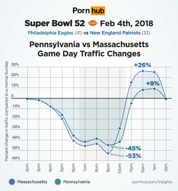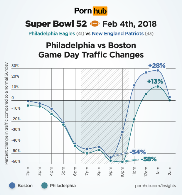 While traffic drops were similar in both Philadelphia and Boston during most of the game, Eagles fans held out a bit longer, with their biggest traffic drop of -58% happening at 10pm. Even Philadelphia’s most dutiful fappers stopped greasing their poles and tuned in to see their team take the championship. By that time however, fans from Boston were already rushing back to Pornhub, where traffic surged +28% above normal in the hours following their defeat.