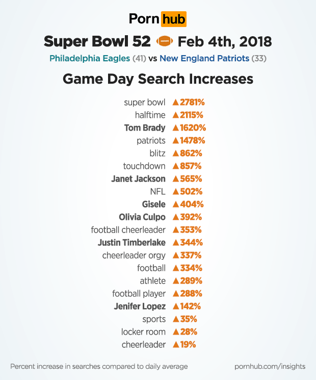 Super Bowl 52 took place on Sunday February 4th, with the defending NFL champions the New England Patriots playing the Philadelphia Eagles. In the end, Philadelphia defeated the Patriots 41-33, to win their first Super Bowl. As Super Bowl Insights have become a tradition here at Pornhub (beginning in 2014), let’s begin this year with a look at Sunday’s top trending search terms.