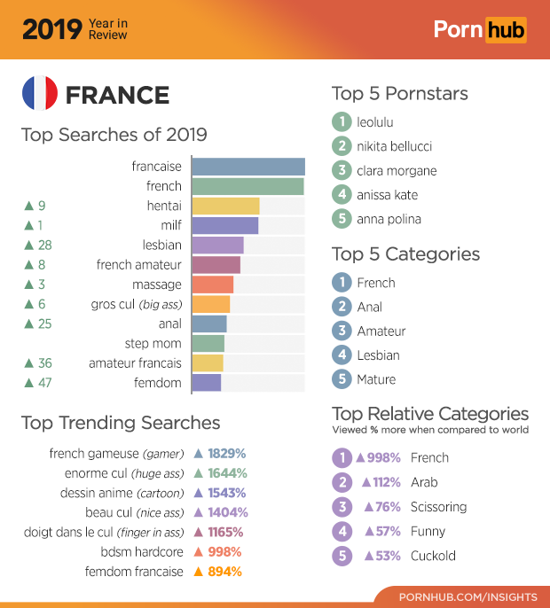 For 2019, ‘Francaise’ remains the most popular search term in France, followed by ‘French’. Searches for ‘hentai’ gained 9 positions since 2019, ‘lesbian’ by 28 and ‘French amateur’ gained 8. Compared to 2018, searches for ‘french gameuse’ (gamer) grew by 1829%, ‘enorme cul’ (huge ass) by 1644% and ‘dessin anime’ (cartoon) by 1543%.