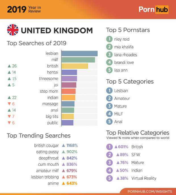 For 2019, ‘lesbian’ and ‘milf’ remain the most searched for terms in the United Kingdom, followed by ‘british’ which gained 26 positions compared to 2018. Other big changes included ‘hentai’ up 14, ‘threesome’ up 15 and ‘Indian’ up 22. When compared to the previous year, searches were up 1168% for ‘British cougar’, 902% for ‘eating pussy’ and 842% for ‘deepthroat’.