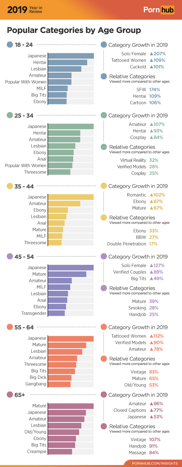 In 2019, ‘Japanese’ replaced ‘Hentai’ as the category most often viewed by visitors aged 18 to 24. Views of the ‘Solo Female’ category grew by 207%, and when compared to other age groups, those aged 18 to 24 were 174% more likely to view Pornhub’s ‘SFW’ content and 109% more into ‘Hentai’.