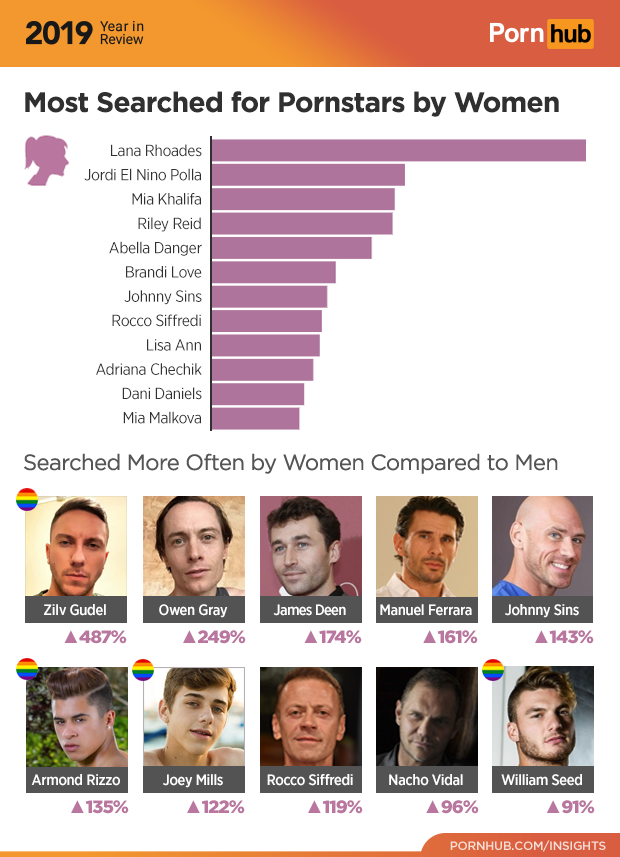 Lana Rhoades (NSFW) was the pornstar searched most often by women, followed by Jordi El Nino Polla (NSFW), Mia Khalifa (NSFW) and Riley Reid (NSFW). When compared to men, women were proportionately 487% more likely to search for Zilv Gudel (NSFW), 249% more into Owen Grey (NSFW) and 174% more for James Deen (NSFW).