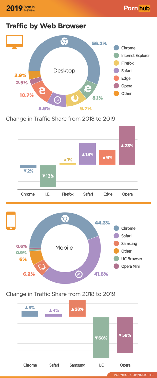 Among desktop web browsers, Chrome still made up more than half of Pornhub’s traffic, but actually decreased 2% in 2019 while Safari saw it’s share gain 13%. Internet Explorer’s share dropped by 13% while Microsoft’s more modern Edge browser grew by 9%.