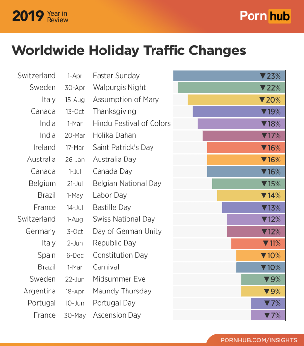 The following chart shows various worldwide holidays that cause traffic to drop on Pornhub in the celebrating countries. National holidays like Canada Day and Australia Day caused a -16% drop in their respective countries. Walpurgis Night caused a -22% drop in Sweden, Bastille Day -13% in France, Carnival Monday -10% in Brazil and -17% during Holika Dahana in India.