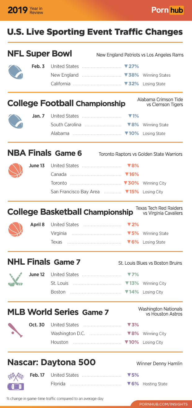Next to New Years, Christmas Eve has the second highest holiday traffic drop in the U.S. by -35%, followed by a -16% drop on Christmas Day. With a little bit of loving on everyone’s minds, Valentines day caused an 8% increase in traffic to Pornhub this year. On Black Friday traffic increased by 5% as people were spending more time in front of their screens and needing a reprieve from shopping for their next bargain.