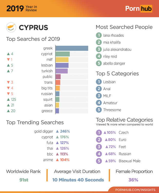 Cyprus ranks 91st for traffic to Pornhub, with 36% of visitors being female, and the average visit length being 10 minutes and 40 seconds. While ‘Greek’ remained the most popular search for another year, searches for ‘Cypriot’ moved into second place. Interestingly, searches for ‘gold digger’ grew by 246% over the last year. While ‘lesbian’ is the most viewed category in Cyprus, visitors are 105% more likely to view ‘Czech’ and 80% more into ‘Euro’ when compared to the rest of the world.