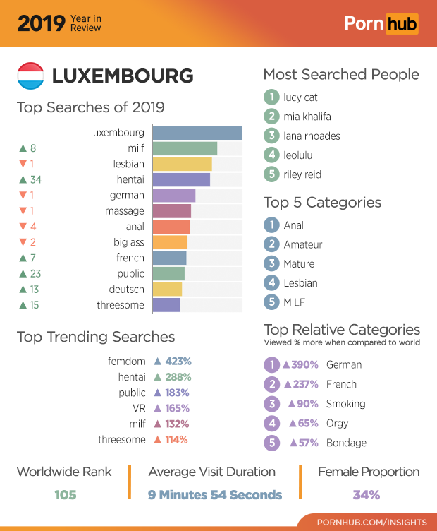 Luxembourgh ranks 105th for traffic to Pornhub, with 34% of visitors being female and the average visit duration being 9 minutes 54 seconds. ‘Luxembourg’ remained the top search for another year, but ‘MILF’ moved up 8 positions to become the second most popular. Searches for ‘femdom’ (female domination) grew by 423% compared to 2018, and ‘hentai’ was also up 288%. ‘Anal’ is the category of video most often viewed by visitors from Luxembourg, but when compared to the rest of the world, they are 390% more likely to view the ‘German’ category and 237% more into ‘French’.