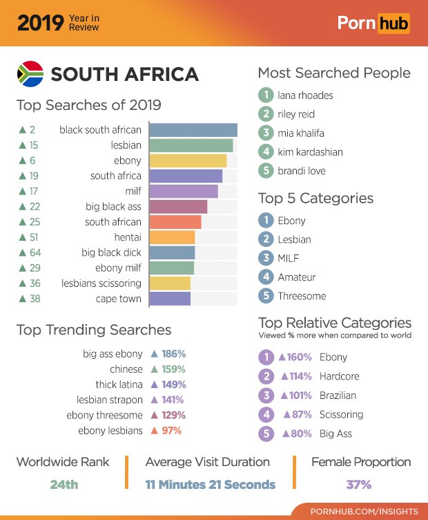 South Africa moved down from Pornhub’s Top 20 countries to number 24 in 2019. The average visitor spent 11 minutes 21 seconds, and 37% of visitors were female. Moving up 2 spots from 2018, ‘black South African’ is now the number one search in South Africa, followed by ‘lesbian’ up 15 spots and ‘ebony’ up 6 spots. Searches for ‘big ass ebony’ increased by 186%, as well as a 149% increase for ‘thick latina’. Visitors from South Africa are 160% more likely to view the ‘ebony’ category, 114% more into ‘hardcore’ and 101% more into ‘Brazilian’ videos.