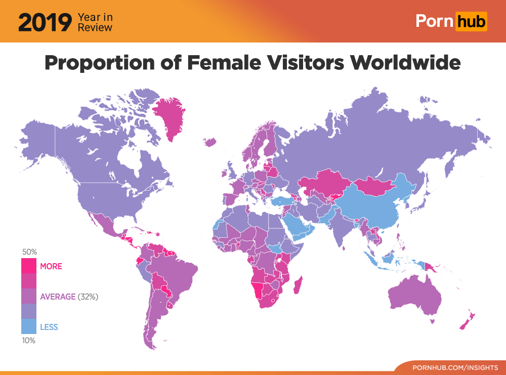 2019 saw the proportion of female visitors grow to 32%, an increase of 3 percentage points over 2018. Among Pornhub’s top 20 traffic countries, the Philippines and Brazil continue to have the highest female proportions at 39%, followed by 36% in Mexico and Argentina. Australia, Poland and Sweden all saw traffic from women grow by 5 percent points in 2019.