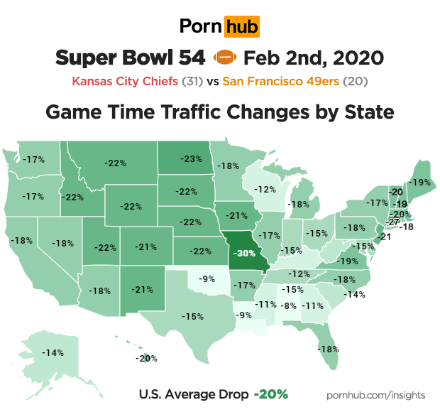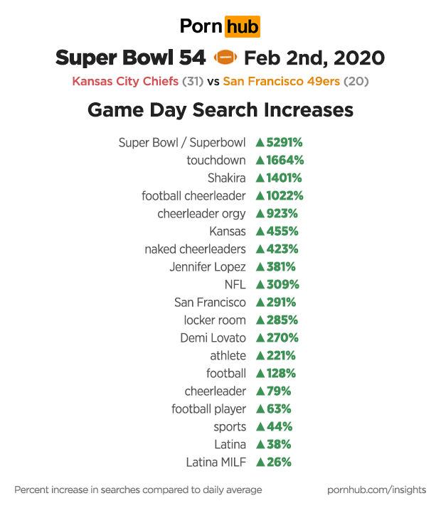 Super Bowl 54 took place on Sunday February 2nd, with the Kansas City Chiefs playing the San Francisco 49ers. In the end, Kansas defeated the 49ers 31 to 20, making it their first Super Bowl win in 50 years. Super Bowl Insights have been a tradition at Pornhub since 2014, so we once again checked in to see how 2020 stacked up compared to previous years.