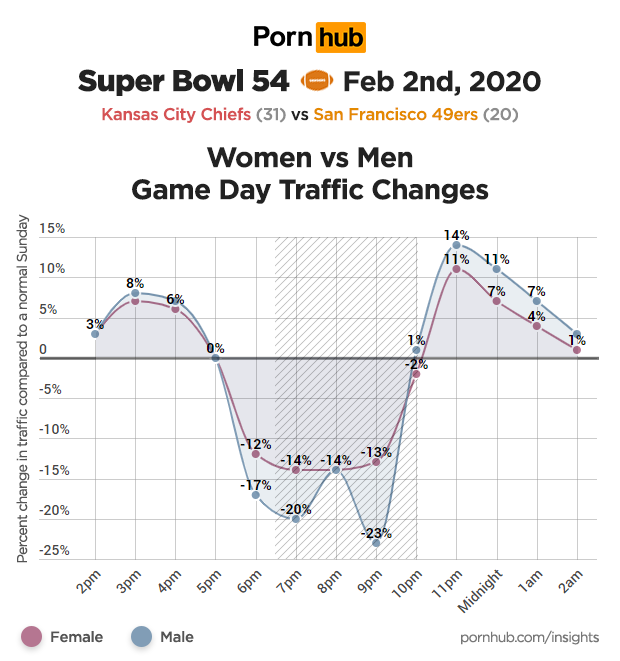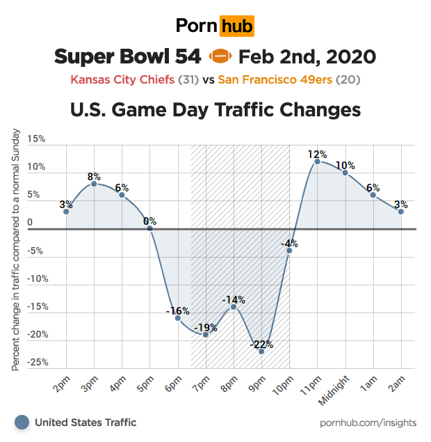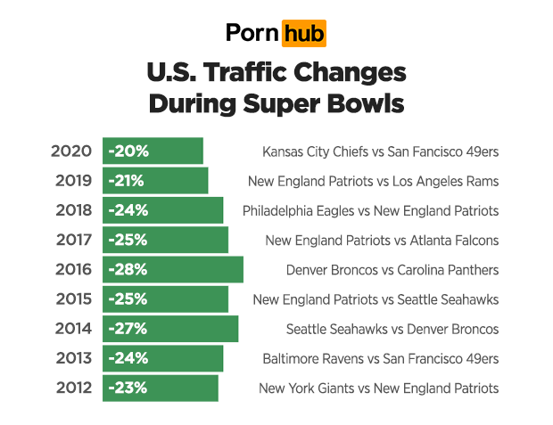The average drop in U.S. traffic during the 2020 Super Bowl was -20%. That’s actually the smallest drop in Pornhub traffic that we have recorded since 2012, with the largest game-time drop being -28% during the 2016 Super Bowl when the Denver Broncos played the Carolina Panthers.