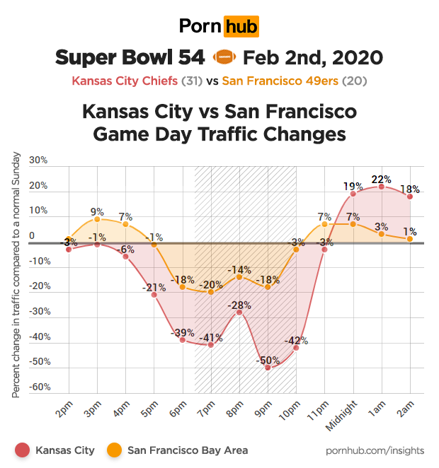 Traffic changes in the San Francisco Bay area closely followed that of the U.S. average, but traffic in Kansas city dipped as far as -50% below average in the fourth quarter. After the game ended, San Francisco’s traffic was up only +7% above average, whereas excited football fans from Kansas City stayed up late and celebrated their win by visiting Pornhub up to 22% more than usual.
