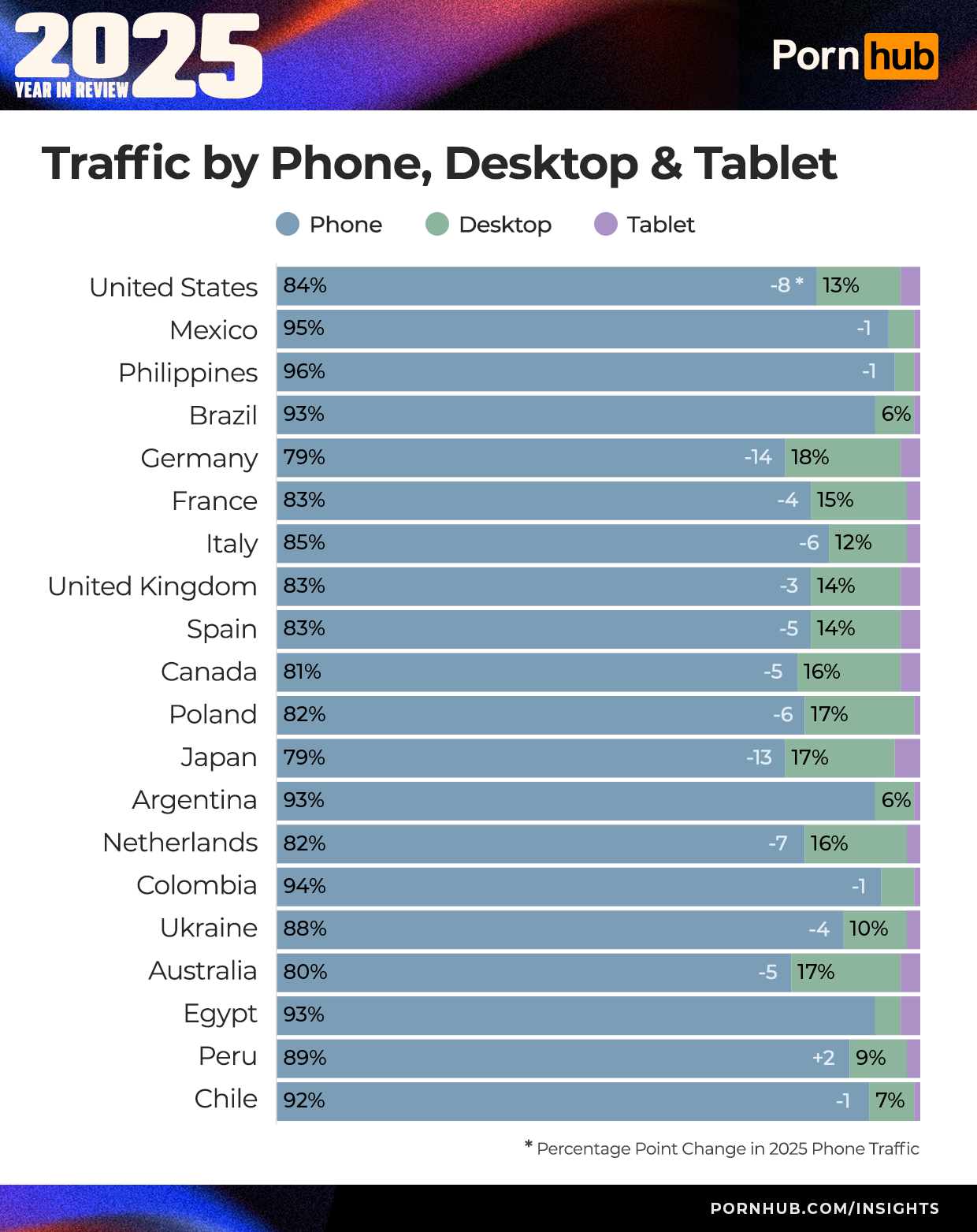 Otherwise, there were no major changes in traffic by country. Overall, the top 20 countries make up 77.5% of all daily traffic to Pornhub. Pleasure is truly a global pastime.