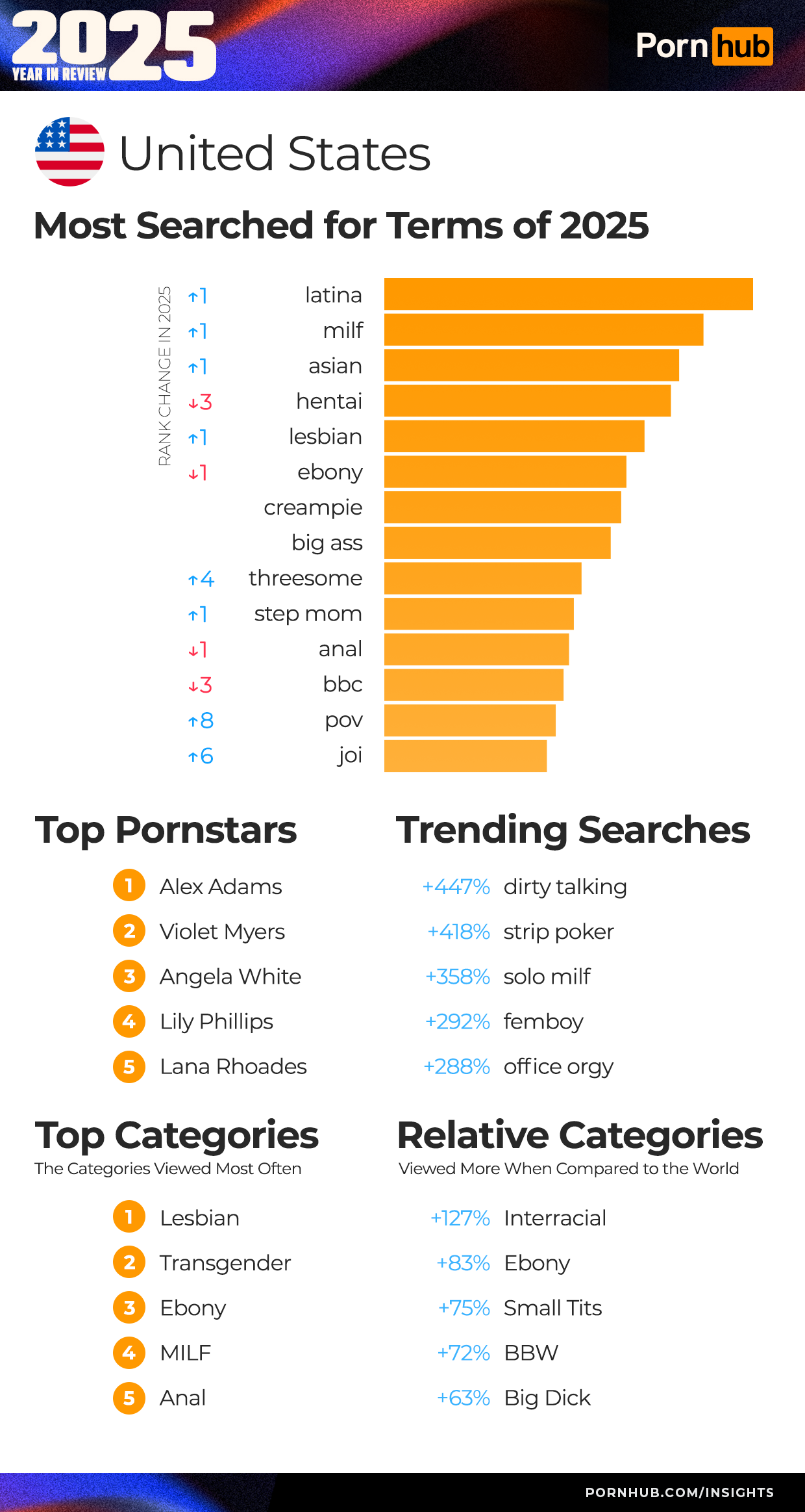 The US saw an increase of “mature” +6 spots, “lesbian” +1 spot, “trans” +5 spots, and “cheating” +5.