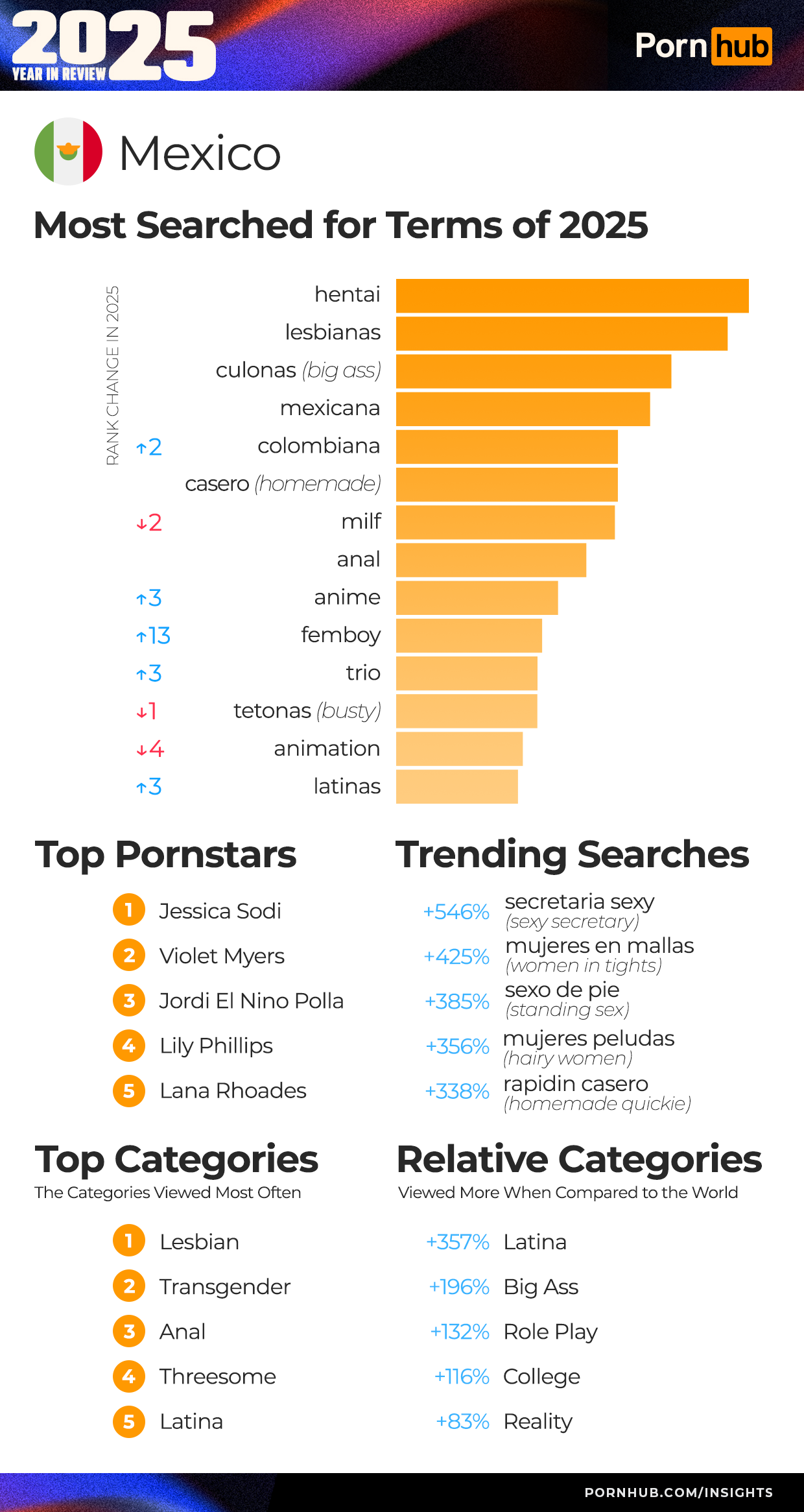Unlike many of their European neighbors, the Netherlands seemed less interested in watching themselves. Searches for “dutch” still appeared in the top 14, but it dropped –7 spots to be 14th overall. Leading was “milf” in 1st, “big ass” in 2nd, and “hentai” in 3rd. Searches for “femboy,” matching the defining trend this year, jumped +10 spots, and “pov” also jumped +9 spots.