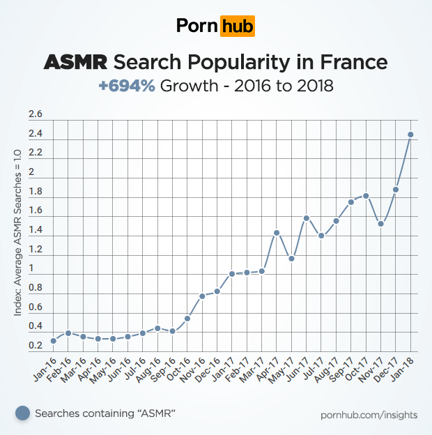 From January 2016 to January 2018, searches for “ASMR” have gained 694% in popularity among French visitors.