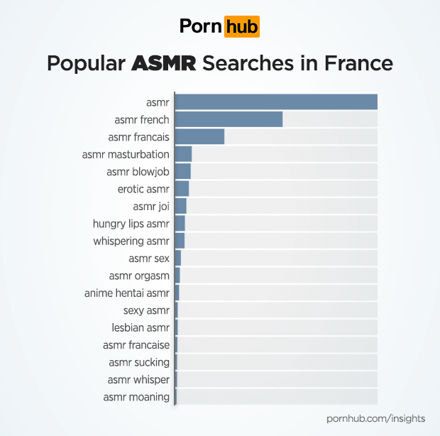 The most popular ASMR related searches in France include “asmr french”, “asmr francais” and “asmr masturbation”. The connection between ASMR and JOI can be seen by the popularity of searches for “asmr joi”.