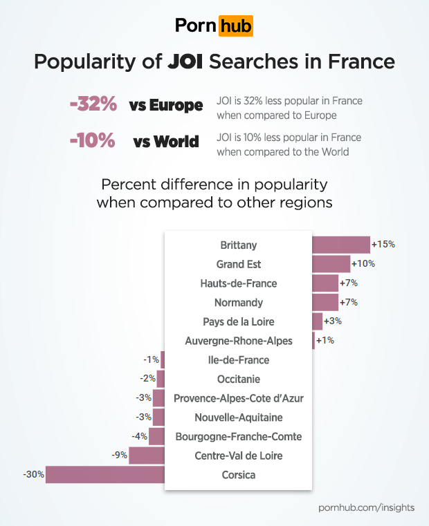 Searches for JOI are -32% less popular in France when compared to the rest of Europe and -10% less than elsewhere in the world. Within France, visitors from Brittany are the most likely to search JOI, whereas visitors from Corsica are -30% less likely.