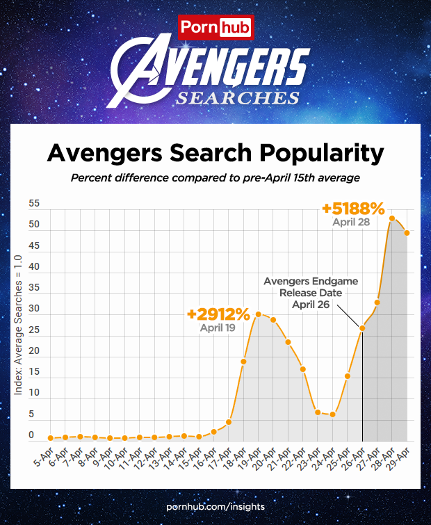 When the last Avengers Infinity War movie was released in 2018, it caused a 356% surge in ‘Avengers’ searches on Pornhub. At the time, that seemed like a sizable increase for an already popular search term. That was then, and Avengers Endgame is now. Men’s Health asked the Insights team to see what effect the new movie has had on searches.