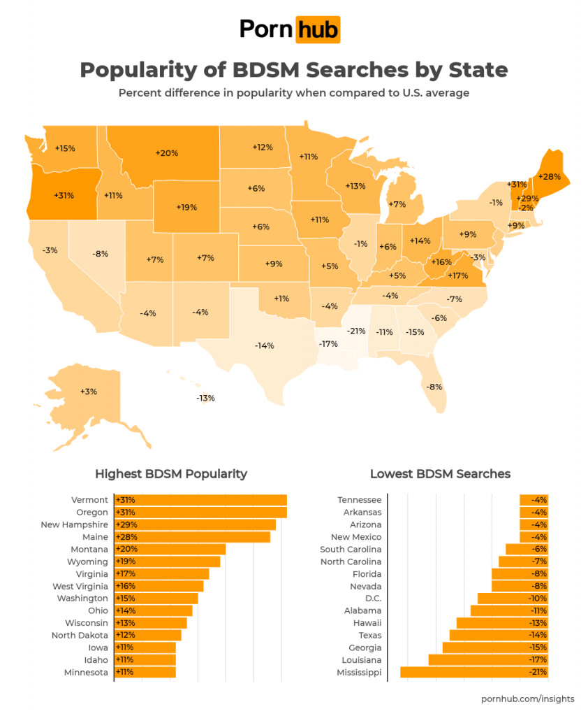 The United States falls -13% below the world average for BDSM popularity, but the popularity by state varies greatly. Vistors from Vermont and Oregon dominate the BDSM searches at +31% above the national average, followed by +29% in New Hampshire and +28% in Maine.