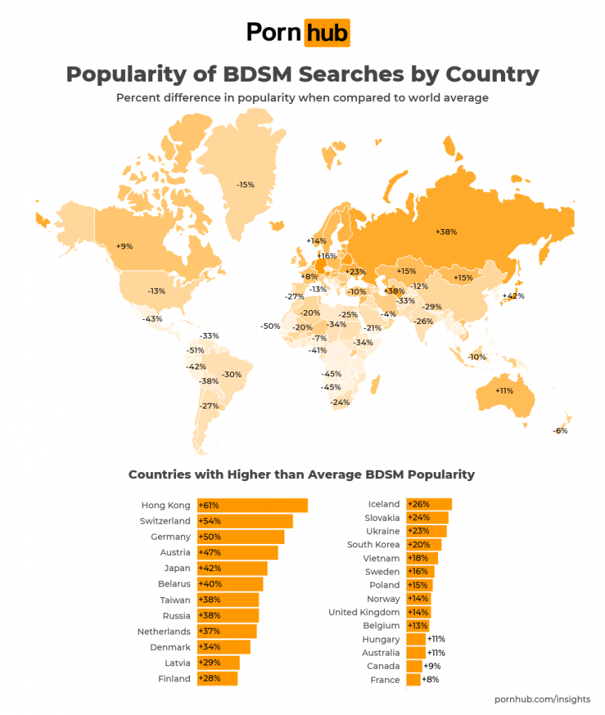 Worldwide, visitors from Hong Kong are proportionately the most interested in searching BDSM by +61% compared to the world average. It also tends to be more popular in European countries like Switzerland (+51%), Germany (+50%), Austria (+47%) and the Netherlands (+37%).