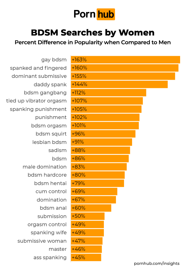 Interestingly, Pornhub’s female visitors are also 160% more interested in content depicting people getting “spanked and fingered”, 144% more into “daddy spank” videos and 105% more into “spanking punishment” themed content. Before trying any of this at home, you’ll want to ask your partner’s permission before engaging in spanking and other aspects of BDSM, but our data shows that it may be a turn-on for many women.