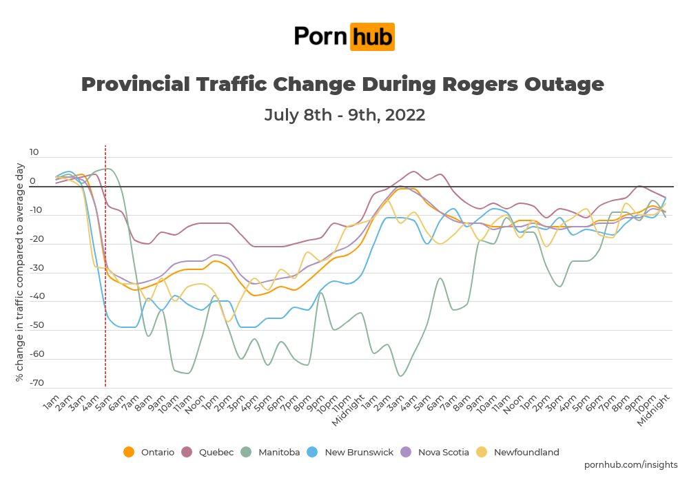 The outage lasted well into the following day, with several provinces harder hit than others. Pornhub’s statisticians followed Canada’s traffic changes throughout the day, and were able to identify just how much of the country was affected by the outage, at least when it came to their favorite times to watch porn.