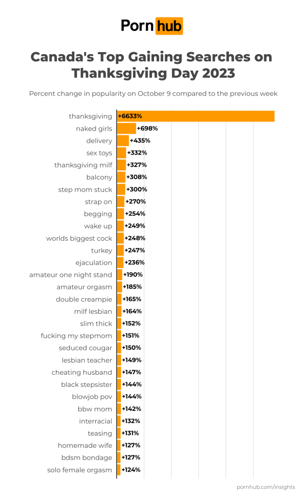When it came to Thanksgiving related searches, visitors were into “thanksgiving turkey,” “thanksgiving dinner,” “thanksgiving stuffing” (who doesn’t like getting stuffed on Thanksgiving?), “thanksgiving creampie,” “step mom thanksgiving” and a good old fashioned “thanksgiving anal.”