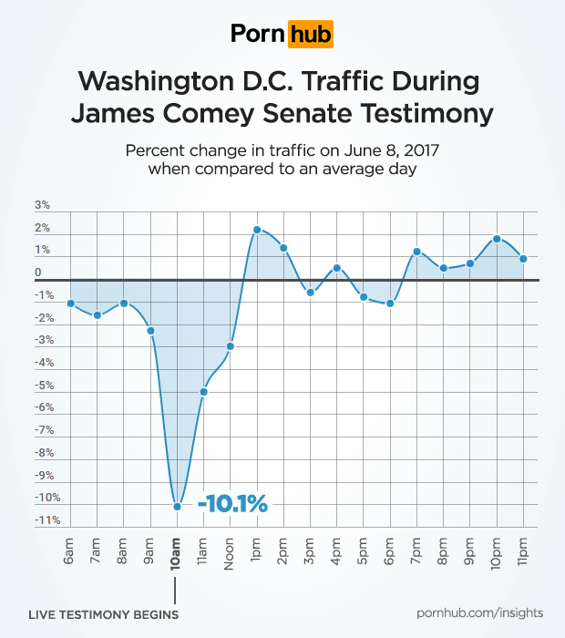 James Comey’s testimony began at 10am ET on June 8th, and compared to an average Thursday, traffic in the Washington D.C. region was down 10.1%. Traffic to Pornhub remained well below average until Noon hour, when it had a quick recovery and remained near normal levels for the rest of the day.
