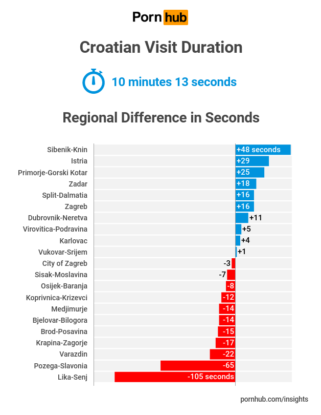 The average visitor from Croatia will spend 10 minutes and 13 seconds on Pornhub, slightly longer than the worldwide average of 9 minutes 59 seconds. Some parts of Croatia get the job done a lot quicker like Lika-Senj, where visitors come and go 105 seconds faster, while in Sibenik-Knin, visitors take their time with an additional 48 seconds.