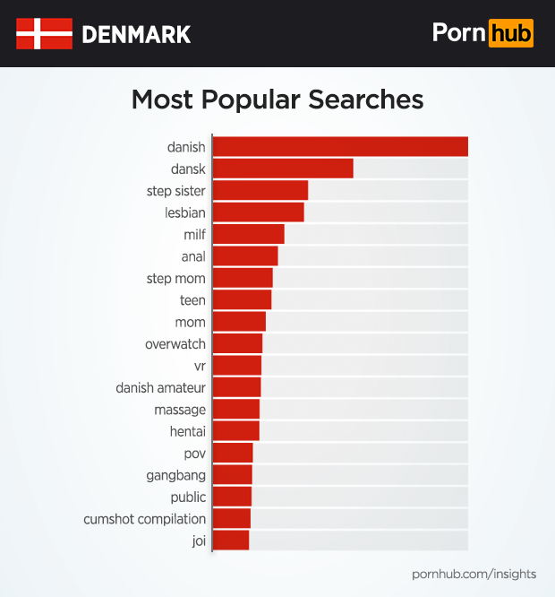 Much like other Scandinavian countries, Danes search more often for their fellow countrymen than any other terms. “Danish” tops the list of popular searches, followed by “Dansk”. Other popular searches include “lesbian”, “milf” (NSFW) and “anal” (NSFW).