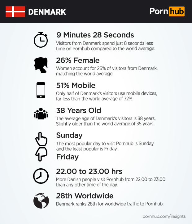 Only about half of Danes visit Pornhub from mobile devices, which is much less than the world average of 72%. In neighboring Sweden, 69% of visitors are using mobile devices. Like most other parts of the world, Sunday is the most popular day for Danes to visit Pornhub, and more people visit between 22.00 and 23.00 hours than any other time of the day.