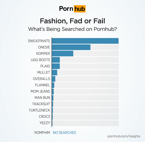Could it be that RompHims are so un-sexy that absolutely no one will dare to search Pornhub? Maybe Pornhub’s users are just too fashion savvy? So our statisticians dug a bit deeper, and discovered that there are many questionable fashions — including the original Romper for women — that do garner searches on Pornhub.