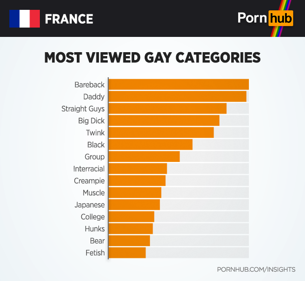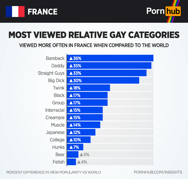When compared to the rest of the world, we can see that the Bareback category is in fact 36% more popular in France, along with a 35% increase in the popularity of both Daddy and Straight Guys. People in France are also 30% more interested in Big Dick gay porn.