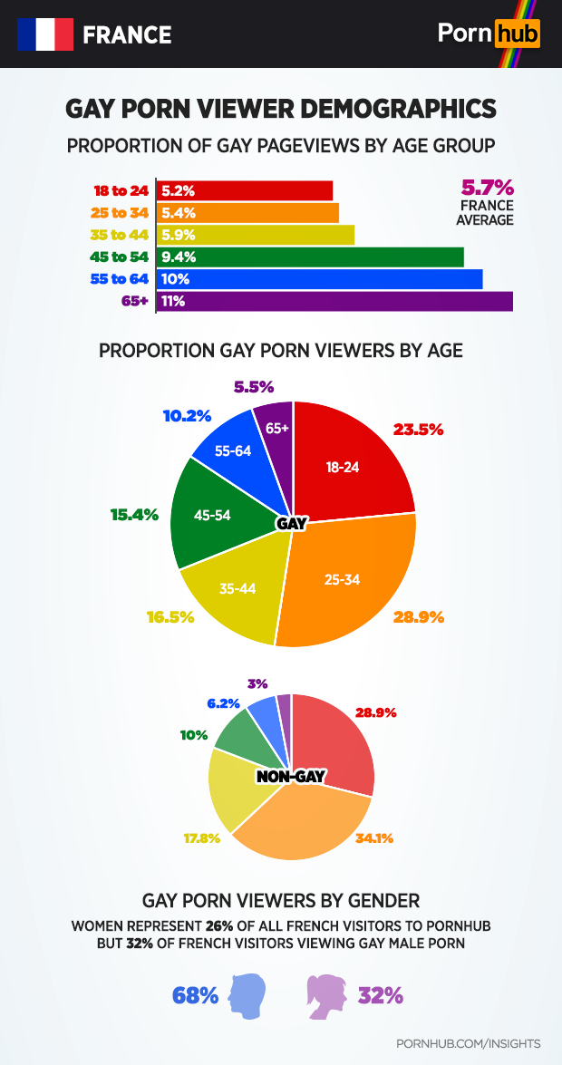 Interestingly, while women make up 26% of Pornhub’s visitors from France, they account for 32% of visitors viewing gay male porn. We found similar results elsewhere in the world in our Girls Who Like Boys Insights post.