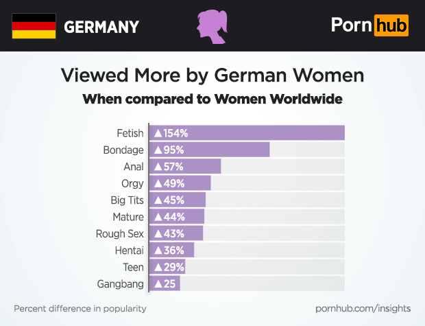 When compared to women elsewhere in the world, Germany’s women are 154% more likely to view the “Fetish” category, and 95% more into “Bondage” videos.