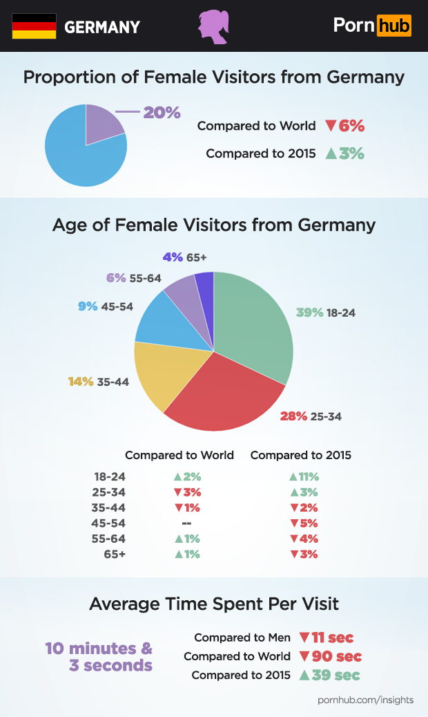 Germany’s women spend an average of 10 minutes and 3 seconds each time they visit Pornhub. That’s 11 seconds less than German Men, and a minute and a half seconds less than the worldwide average for women. Germany’s women have been stepping up their game lately, as we’ve seen a 39 second increase in time on site since 2015.