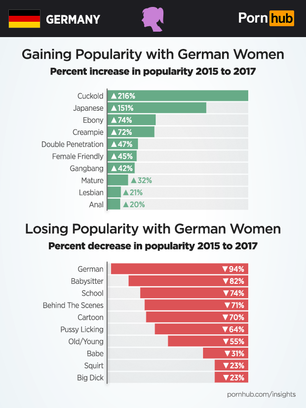 Since 2015, our statisticians have found 216% increase in the popularity of the “Cuckold” category among Germany’s women. In our All About Cuckolding study, we found similar gains worldwide. The “Japanese” category has gained 151% in popularity, along with more than a 70% increase in “Ebony” and “Creampie”.