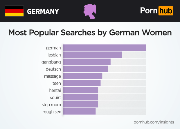 The most popular search term among German women is “German”. The preference to view porn featuring fellow countrymen is a trend we’ve seen in most countries worldwide, and it holds true for women as we discovered in our study of Scandinavian Women across all five countries.