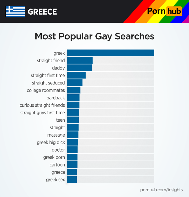 The most searched for term by gay visitors from Greece is “Greek”, followed by “straight friend”, “daddy” and “straight first time”.