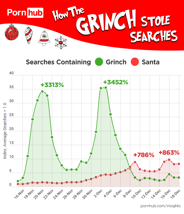There have been been numerous Grinch related porn parodies made over the years, but nothing compared to the 1200+ Santa themed videos currently on Pornhub. Nonetheless, the Grinch holds his own when it comes to holiday searches. Our friends at Metro UK asked us to take a closer look at the Grinch’s porn searches.