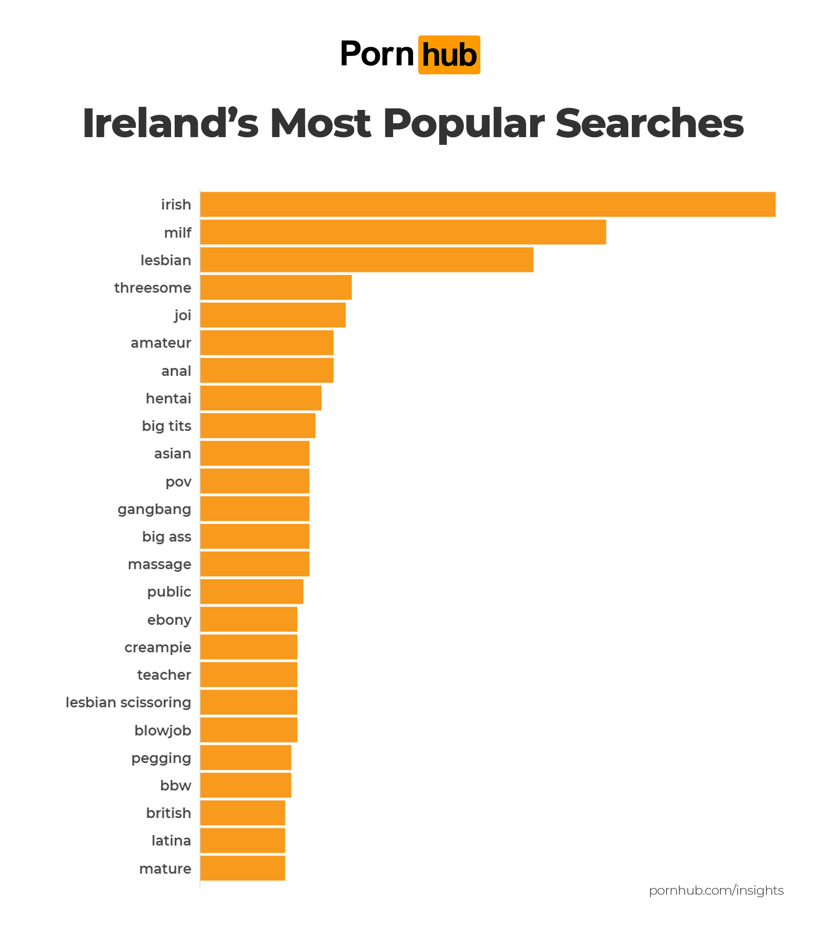 The most popular search term in Ireland is “Irish”, which is a common trend among the countries we’ve studied. The next three terms, “milf”, “lesbian” and “threesome” are popular around the world, with “JOI” (Jerk Off Instructions) being the fourth most popular.