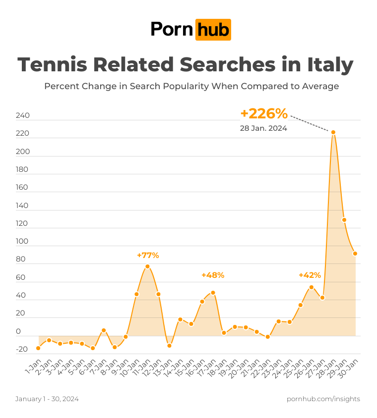 The Italians were so excited about these results that the country entered a tennis-fever. So, how did these celebrations affect Pornhub? Our statisticians took a closer look at the search terms for our friends at ADN Kronos.