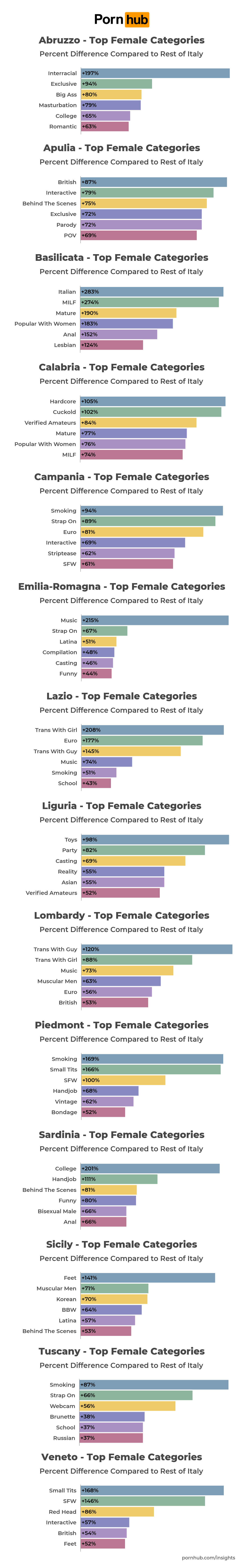For example, women in Basilicata are very patriotic, they watch the “Italian” category +283% more than the Italian average. Calabria women are +105% more passionate about “hardcore” then their compatriots. In Emilia – Romagna women get incredibly aroused by…”Music”! +215% iff compared to the rest of the country.
