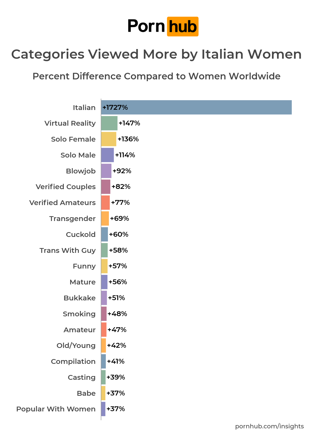We then find “Solo Female”, +136%, “Solo Male”, +114%, “Blowjob”, +92%, and “Verified Couples” and “Verified Amateurs”, which once again confirms Italian passion for amateur porn.