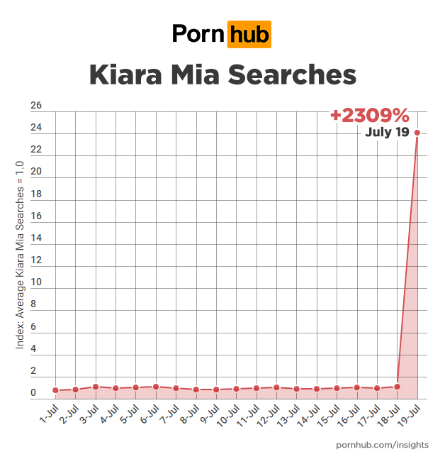 TMZ captured 49ers Quarterback Jimmy Garoppolo on a Beverly Hills date with busty Pornstar Kiara Mia (NSFW). Kiara is one of Pornhub’s most popular latina pornstars, with over 62 million views of her videos. After news of her date hit the internet on July 19th, she has racked up over 200,000 searches in just 24 hours — a massive 2309% increase over her daily average!