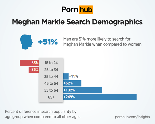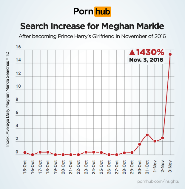 The engagement announcement wasn’t the first time Pornhub’s visitors showed increased interest in Meghan Markle. In November of 2016 when it first became public that she was dating Prince Harry, searches shot up by 1430%.