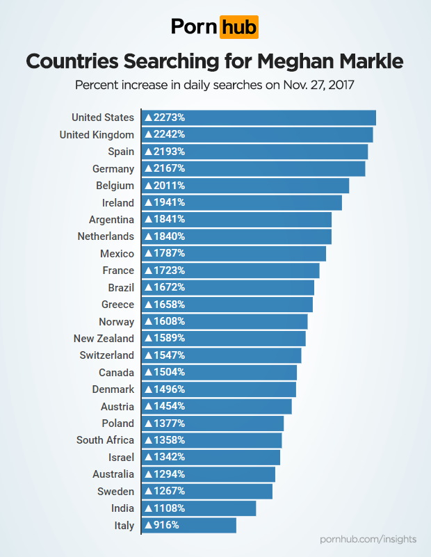 On November 27 it was officially announced that Prince Harry would wed American actress Meghan Markle. While most royal Pornhub searches are contained to parody characters like Princess Peach and Princess Leia, the engagement announcement none-the-less caused a massive search increase for soon-to-be princess Meghan Markle.