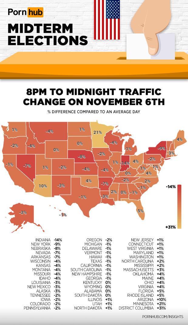 The following heat-map illustrates that Pornhub traffic from Noon to 7pm dipped the lowest in Indiana, Arkansas, Nebraska, Nevada and New York. Traffic was up higher than usual in Delaware, West Virginia, Virginia and Minnesota with the largest increase of the day in the District of Columbia by a massive +39% above average. It would seem that midterm erections were on more people’s minds in the capital.